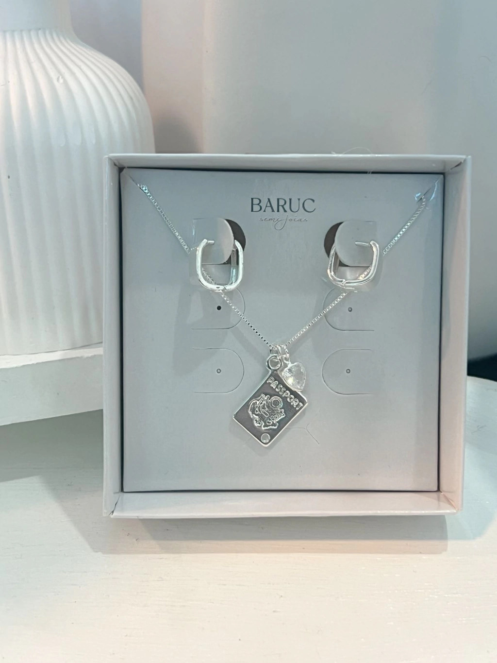 O conjunto combina o colar passaporte — moderno e cheio de significado — com brincos quadrados largos em prata, que trazem um toque de elegância minimalista. Uma composição leve, charmosa e perfeita para quem ama explorar o mundo com muito brilho.